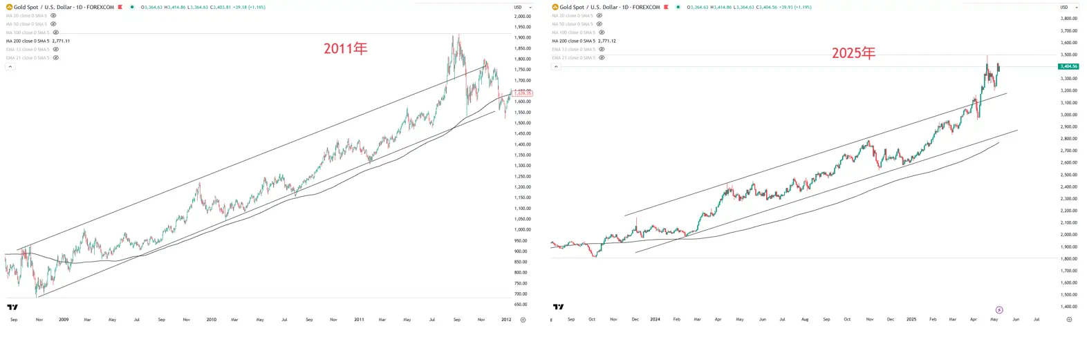 值得注意的是,目前金价高出200天均线24%左右,并且处于2023年以来的上涨趋势的末端加速阶段,这和2011年的走势较为相似。